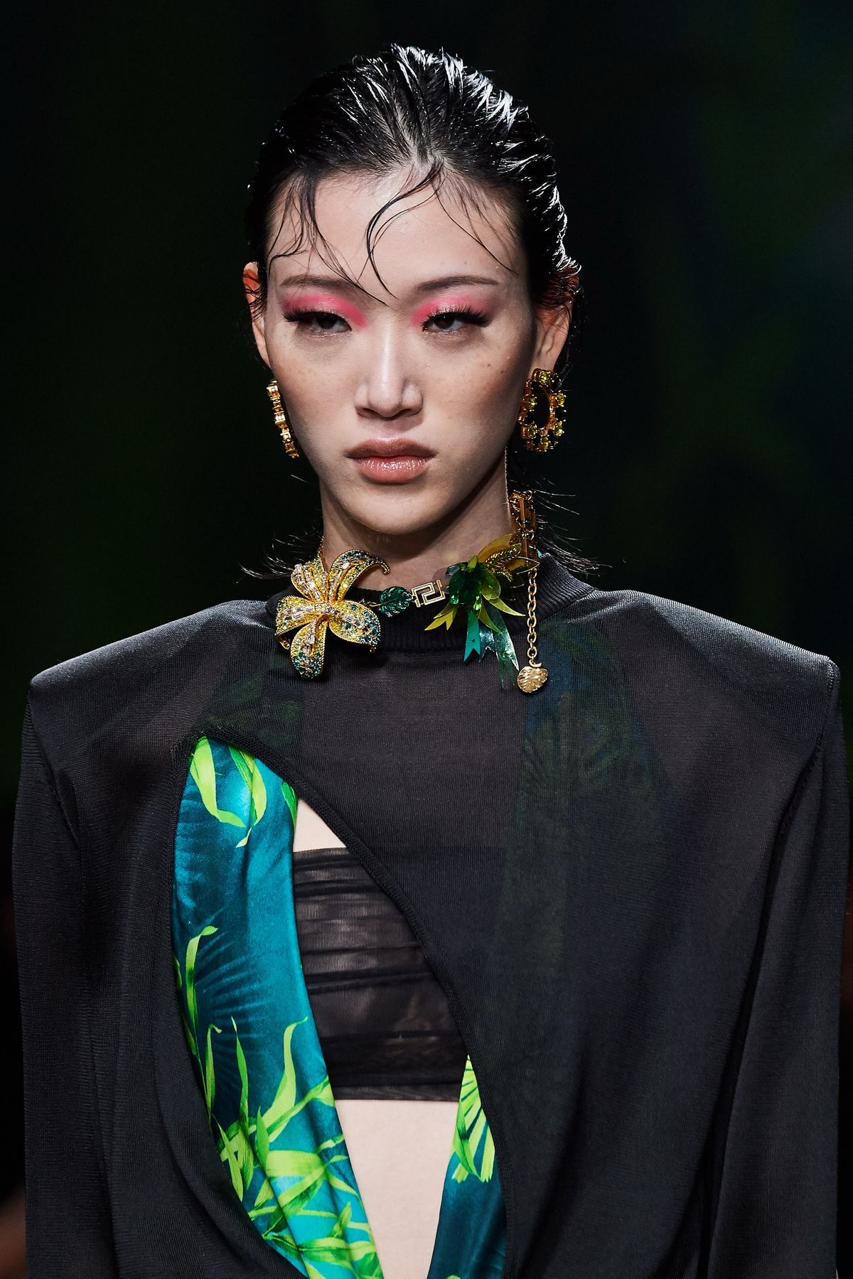 Las texturas metálicas y acabados foil añadieron un efecto tridimensional. Oro, plata y colores holográficos captaban la luz en cada movimiento, aportando dramatismo y modernidad. Estos acabados funcionan tanto en maquillajes de pasarela como editoriales, donde la fotografía resalta cada reflejo y detalle.