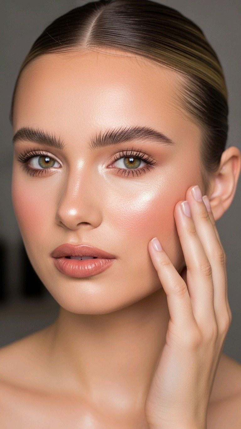La iluminación intensa es estratégica y perfectamente colocada. No se trata solo de brillo, sino de esculpir el rostro con técnica: pómulos elevados, puente de la nariz definido y contornos suaves pero marcados que aportan estructura y elegancia. La piel luce impecable, uniforme y con un acabado pulido de alta cobertura.