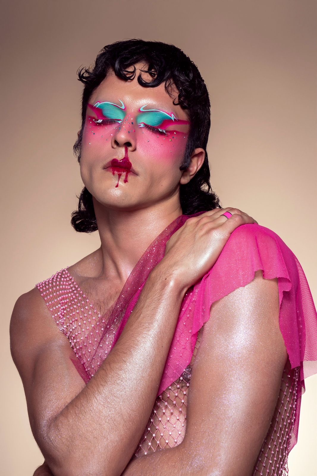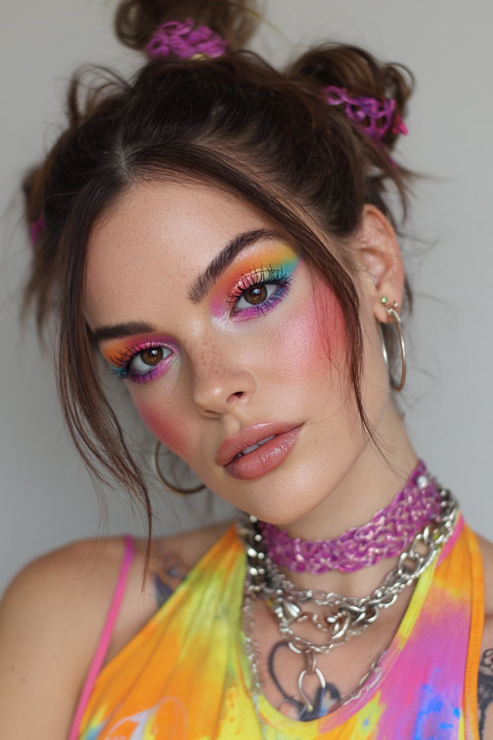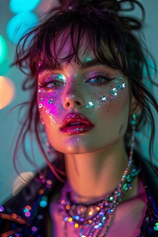 Características del look: Delineados en tonos neón, sombras vibrantes, rubor fresco y piel luminosa. Este look refleja creatividad, energía y personalidad.