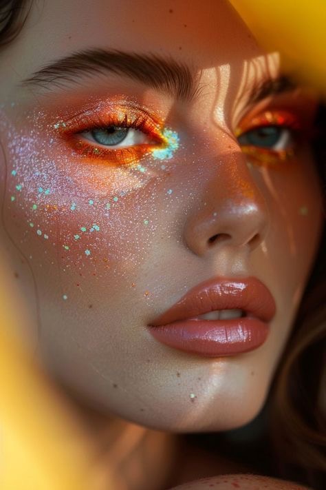 Glitter y pedrería facial: Pequeños cristales o toques de glitter alrededor de los ojos o pómulos aportan brillo y dimensión al maquillaje.